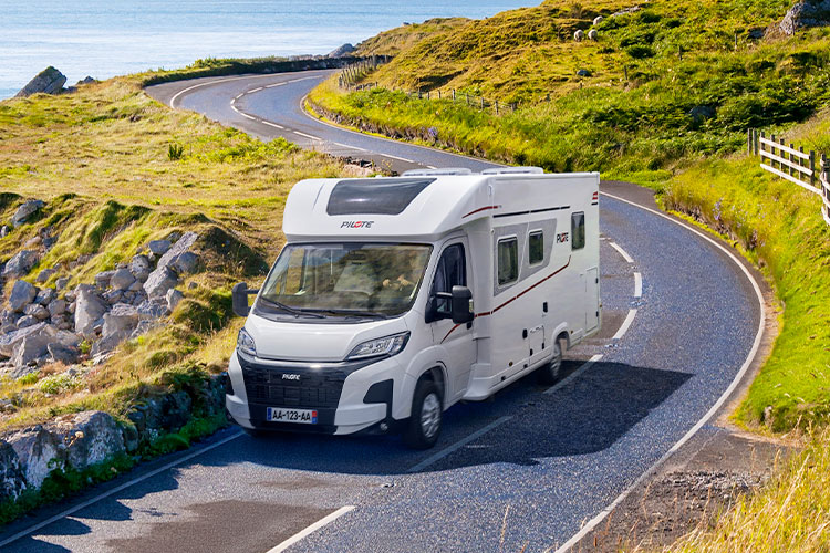 camping-car profilé Pilote roulant sur une route de bord de mer