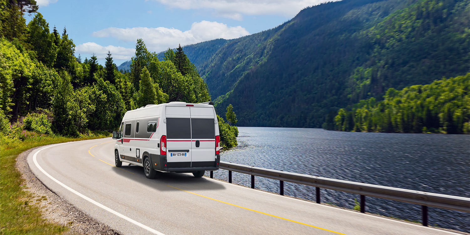 camping-car profilé Pilote roulant sur une route de bord de mer