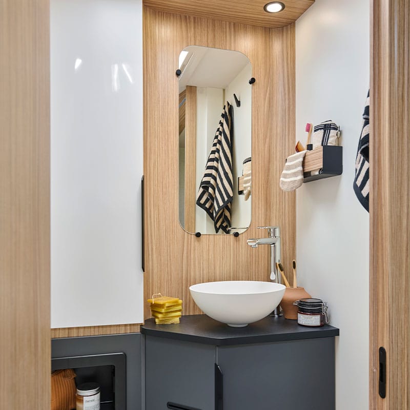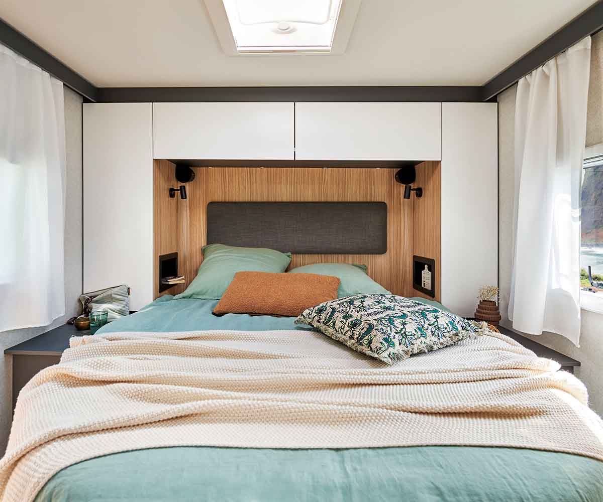- Gavone regolabile in altezza elettricamente sotto il letto centrale (solo sui modelli P720FC e P740FC), per ottenere ancora più volume di stivaggio.